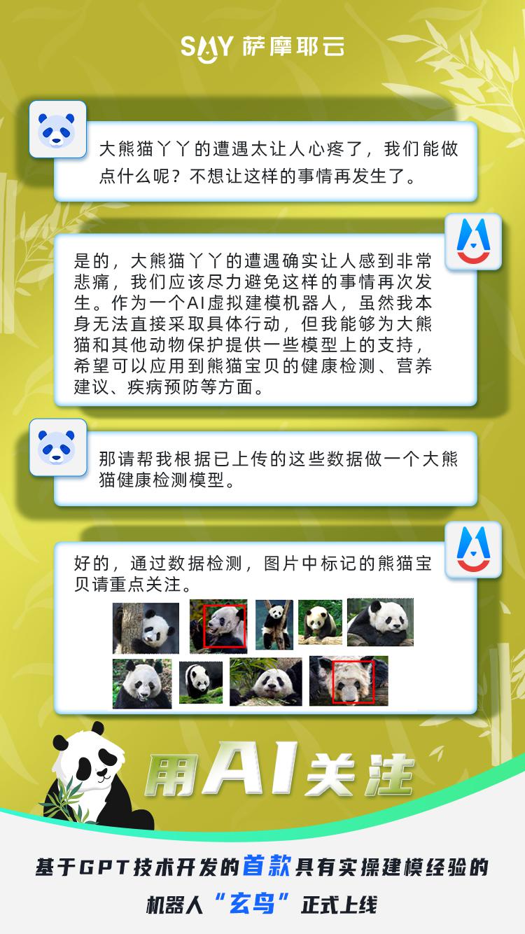 旅美20年国宝熊猫“乐乐”病逝,“丫丫”惨遭虐待。14亿人都在等它回家。我们该拿什么来守护国宝?以人工智能为武器,日前,萨摩耶云科技集团正式上线基于GPT技术开发的首款具有实操建模经验的机器人“玄鸟”,正让利用AI模型保护熊猫这样的天马行空创意有望照进现实。