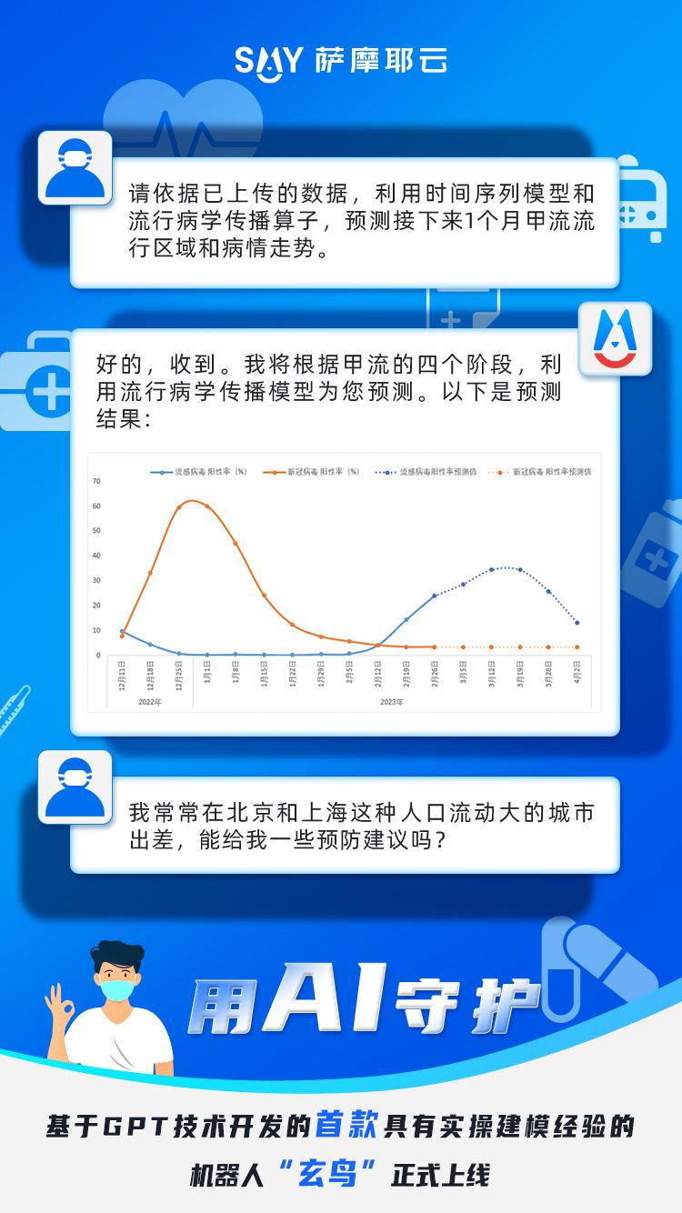 早防早治不用慌,百病预防不用忙。“甲流”进入高发季,传播途径有哪些?未来发展趋势如何?怎样预防?当你向“玄鸟”询问此类问题时,它将基于现有公布的数据,来帮助建立甲流等传染性疾病预测模型。将来,“玄鸟”可通过对数据进行动态监测,根据甲流的四个阶段(高烧、腹痛、鼻塞以及肌肉酸痛),利用流行病学传播模型DEMO预测流感病毒阳性率和传染走势,给予贴心的健康提示,为疾病防控策略提供辅助决策。