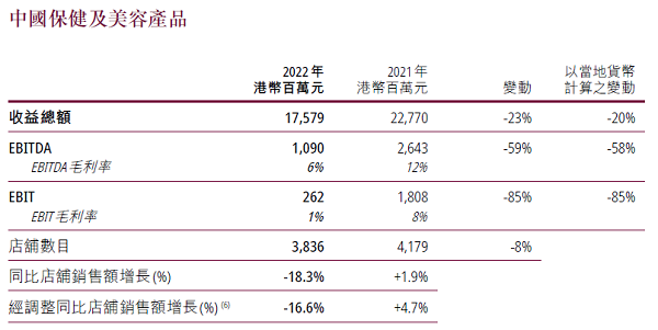 近期,屈臣氏2022年业绩公布。财报显示,受综合因素影响,屈臣氏中国市场营175.79亿港币(约合人民币154.50亿元),同比下降23%;整体依然盈利,录得EBITDA息税折旧摊销前利润10.9亿港币(约合人民币9.58亿元)。