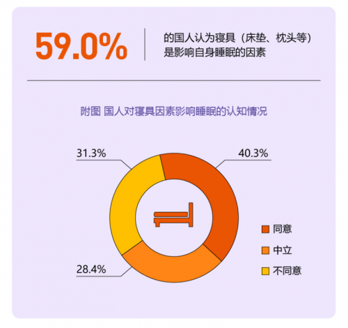 《中国睡眠研究报告2023》显示,2022年大众睡得更晚、起得更晚,入睡时间集中在23点至1点,比2021年大众的集中入睡时间向后推迟了1个小时。在影响睡眠质量的诸多外部因素中,59%的受访者认为寝具因素,如床垫、枕头、被褥等影响睡眠质量。