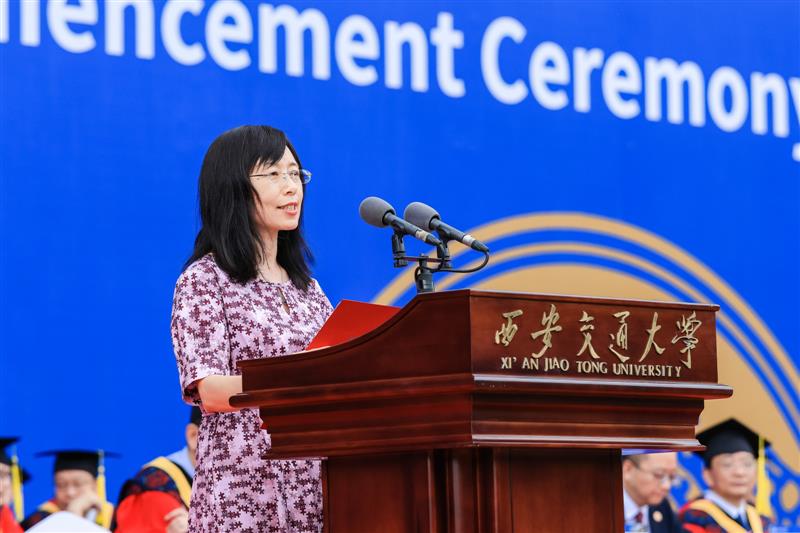 毕业生家长代表、中远海运集团中货公司青岛片区总经理黄丽红表达了对学校的感谢。她表示,交大人始终把回馈社会、报效祖国的责任担在肩上,希望同学们未来能够直面人生中的挑战,成长蜕变为有胸怀、有格局,自信自强的西迁精神新传人。