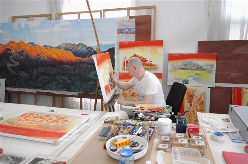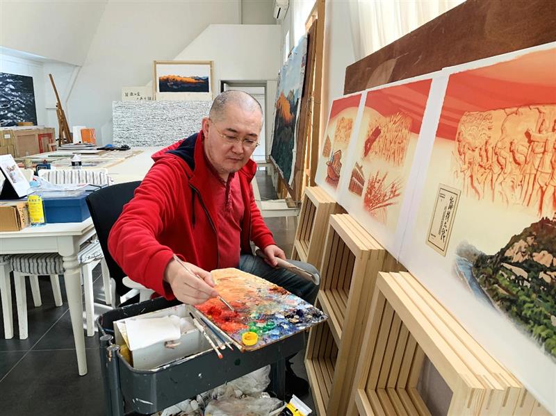 郝军正在绘制人民大会堂壁画《金山岭晨光》