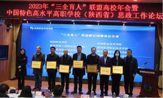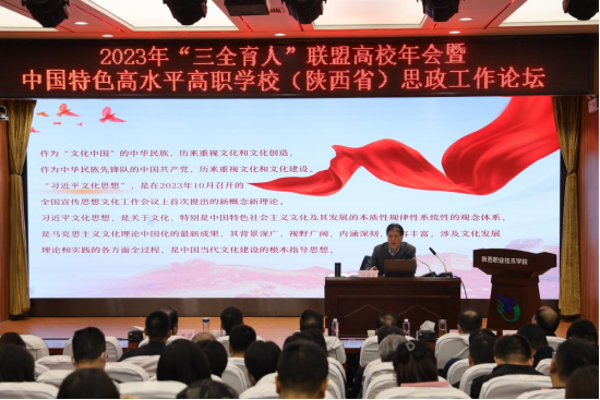 为全面学习贯彻习近平总书记对宣传思想文化工作的重要指示精神,全面贯彻落实教育部等十部门印发的《全面推进“大思政课”建设工作方案》精神和要求,进一步推动中国特色高水平高职学校高质量发展,12月8日,2023年“三全育人”联盟高校年会暨中国特色高水平高职学校(陕西省)思政工作论坛在陕西职业技术学院白鹿原校区召开。“三全育人”联盟理事长、陕西职业技术学院党委书记赵小峰,“三全育人”联盟副理事长、陕西理工大学党委副书记陈莉,“三全育人”联盟副理事长、西安航空职业技术学院党委书记金文,陕西职业技术学院党委副书记、校长张弘出席大会,17所“三全育人”联盟高校代表参加大会。陕西职业技术学院党委委员、副校长段东旭主持大会。
