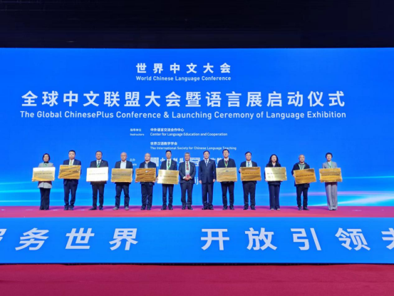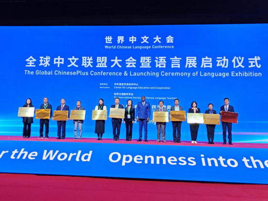 全球中文联盟大会是世界中文大会的系列活动之一。大会邀请全球115个国家和地区的嘉宾共赴中文之约,共话协同创新,共商发展愿景,共享美好未来。为展现并表彰中文联盟全球合作伙伴的新成果、新项目,大会举行了12所国际中文教育专业、中文+职业教育“语言桥”特色实践基地授牌仪式,为103家中文联盟数字化教育“金牌合作机构”,32门中文联盟数字化教学“金课”,50位“金牌教师”,以及45位“全国首届国际中文教育教学技能大赛”获奖代表颁奖。陕西职业技术学院被中文联盟确定为中文+职业教育“语言桥”特色实践基地,获评中文联盟数字化教育“金牌合作机构”,校党委书记赵小峰代表我校上台领奖。