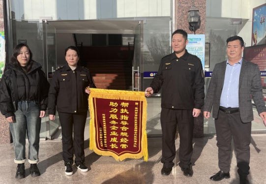 2024年1月3日,某医药连锁公司负责人一行来到禹州市市场监管局,将刻着“帮扶指导合规经营助力服务企业成长”的锦旗送到执法人员手中,同时送达了《感谢信》,表达对企业贴心服务,为企业排忧解难的感谢。