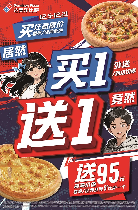 *“买一送一“活动规则:活动时间:2025年12月5日-2025年12月21日,10:00-22:00。活动期间,原价购买任意9"或者12"尊享系列/经典系列比萨1个,可获赠任意尊享系列/经典系列/超值系列9"比萨1个,获赠价值不高于购买比萨产品原价,可在本单中选择直接赠送比萨或获得“比萨免费赠券”1张,两种赠品只能选择其一。“比萨免费赠券”有效期至2026年1月4日21:59;“比萨免费赠券”为赠品,到期自动失效,不可延期或退款。此活动适用于达美乐比萨中国大陆官方线上渠道(官网、官方微信公众号及小程序、官方APP),不与其他优惠同享。部分门店营业结束时间延长至24:00的,比萨免费赠券”有效期至2026年1月4日23:59,具体门店营业时间信息请以达美乐比萨中国大陆官方网上订餐渠道页面显示及电话订餐渠道(订餐电话:4001-597-597)反馈为准。