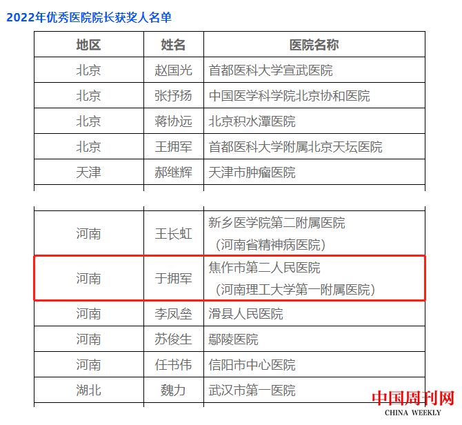 河南理工大学第一附属医院院长于拥军荣获2022年全国“优秀医院院长”称号