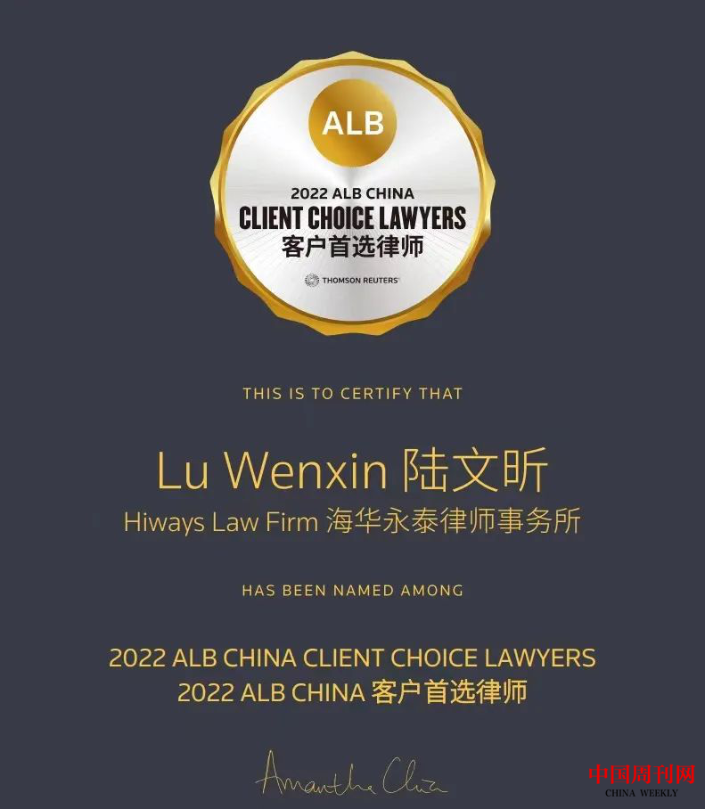 出彩中国律师:陆文昕荣膺2022 ALB 中国客户首选律师榜单
