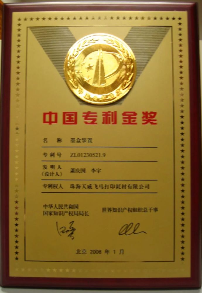 作为专利安全产品领域的先驱,天威投入100多万人民币自主研发的“86T墨盒装置”获得了国家专利最高奖项——第九届“中国专利金奖”,该奖也是中国唯一获得世界知识产权组织认可的奖项。