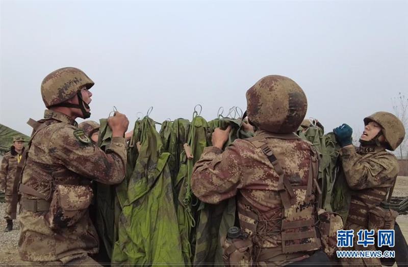宿营保障队参赛队员在搭设野战宿营帐篷(11月30日视频截图)。新华社发(吕冀周 摄)