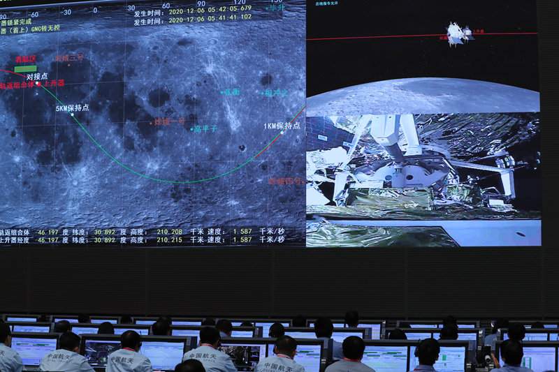 12月6日,航天科技人员在北京航天飞行控制中心指挥大厅监测嫦娥五号上升器与轨道器返回器组合体交会对接情况。