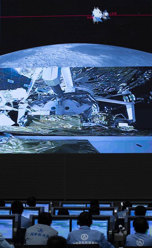 记者从国家航天局获悉,12月6日5时42分,嫦娥五号上升器成功与轨道器返回器组合体交会对接,并于6时12分将月球样品容器安全转移至返回器中。这是我国航天器首次实现月球轨道交会对接。新华社记者 金立旺 摄