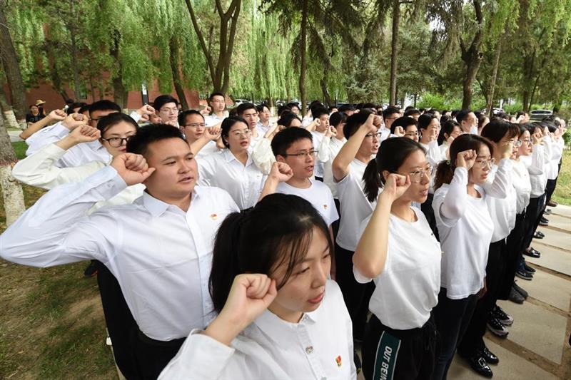 在陕西,延安市新党员代表入党宣誓活动在位于延安枣园革命旧址的“为人民服务”讲话台进行。新华社记者张博文摄