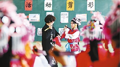 4月12日,在河北邢台市隆尧县第三实验小学京剧课堂,戏曲老师指导学生练习京剧表演基本功。 |