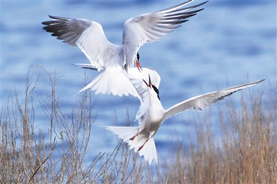 两只须浮鸥在山东省青岛市城阳区红岛街道一处沿海湿地追逐嬉戏。 |