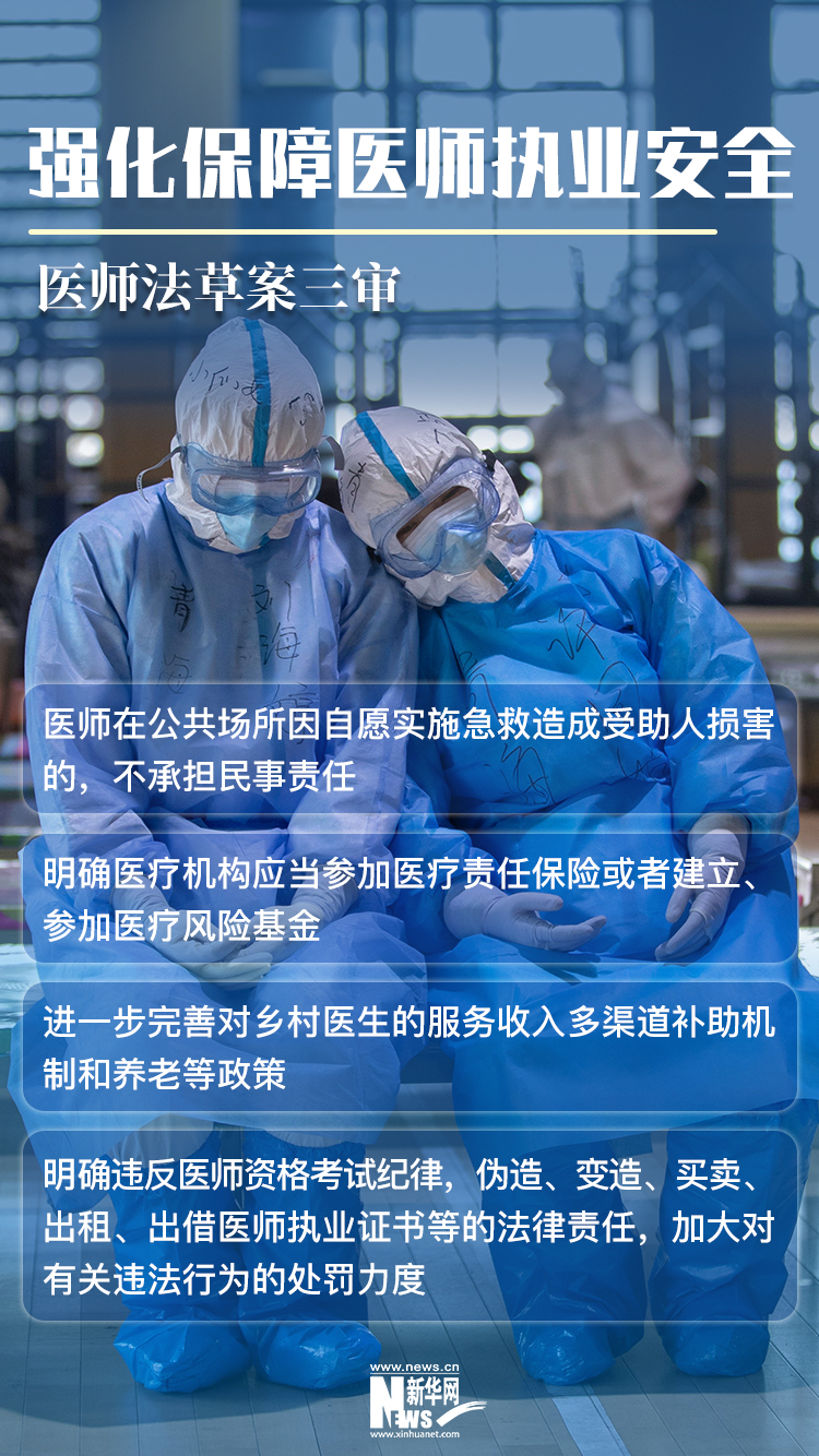 同时,为保护患者合法权益,防范“过度医疗”,医师法草案详细规定了医师在执业活动中应当履行的义务、开展医学临床研究和诊疗活动等的规则。医师在执业活动中应当遵守上述规定,使用适宜技术和药物,合理诊疗,因病施治。如果医师对患者实施了不必要的检查、治疗,造成不良后果的,医师法草案规定了相应的法律责任。(文字:卢俊宇 设计:王晔 资料来源:新华社、中国人大网)