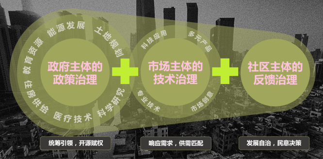 形成城市的共治,关键并不是实践城市治理的行动逻辑,而是治理主体的改变。简单的说,推动城市共治的第一个行动维度, 是必须由单一的政府主体转移到三大主体进行共治: