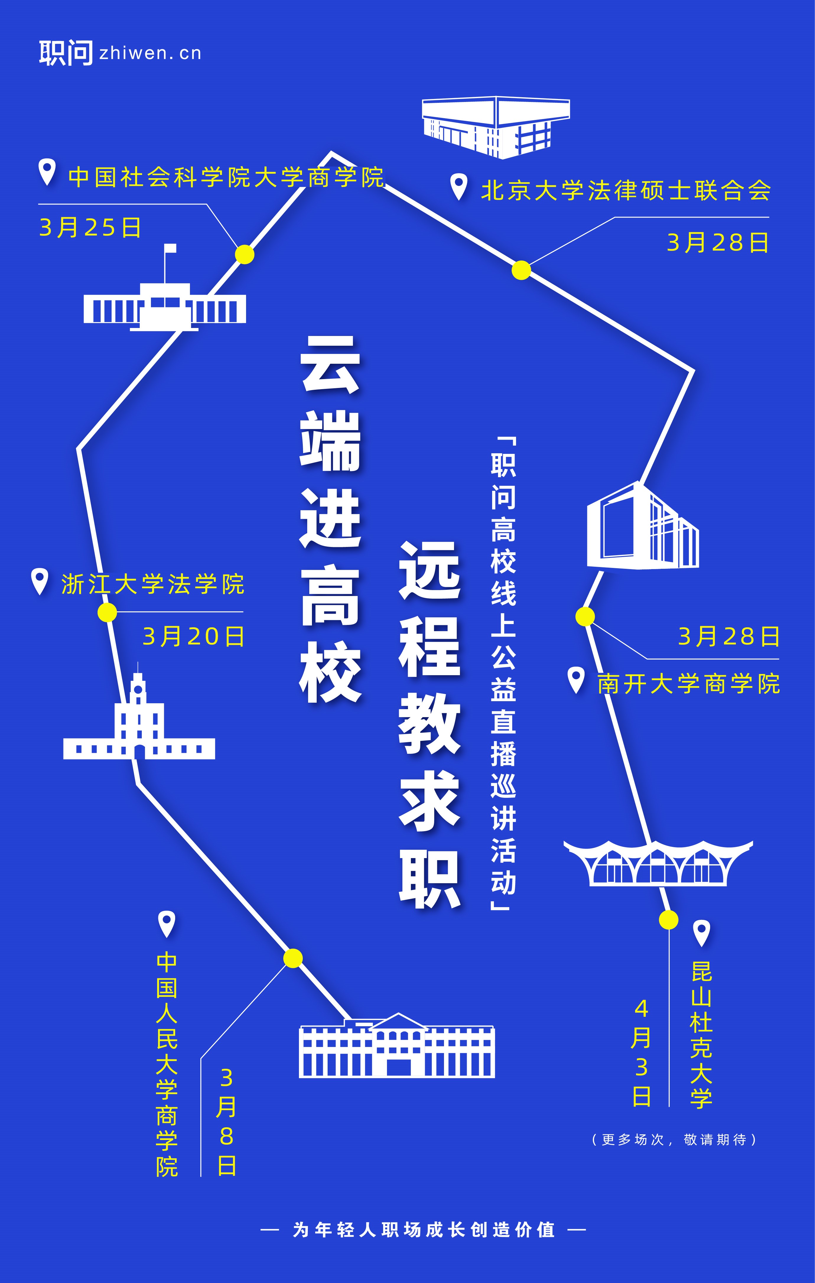 据悉,职问本周将完成高校公益线上直播系列巡讲活动的最后一站,走进昆山杜克大学,推出“求职攻略直播课”课程,结合该校学生热门话题,涵盖远程面试技巧、职业能力提升、最新行业求职信息等内容,为面临求职难题的的毕业生解决求职难点,助力他们得到职业能力的提升,顺利走上职场第一步。