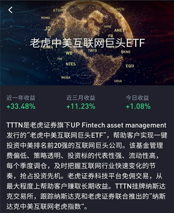 这只ETF目前在老虎证券APP中实行免佣金交易。这是全球首个专注于同时跟踪中美两国互联网巨头的ETF产品。一只基金,同时抓住中美两国互联网企业的发展红利,对于投资者来说是一举两得 。