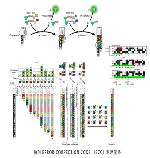 赛纳生物基于NGS测序原理以及信息通讯领域的“编码校验”概念,研发了新的高精度测序方法。其采用对ACGT四种碱基进行正交组合测序以产生简并序列,获得的序列具有自校验功能,测序完成后,利用高准确度的纠错解码算法,可自动检测到在测序过程中发生的痕量测序错误并予以纠正,从而在保证读长的同时极大提高准确度。