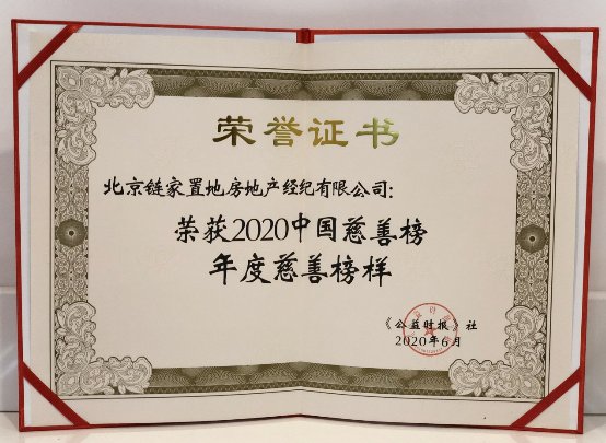 6月16日,2020中国慈善榜在北京发布,链家凭借在精准扶贫及社区抗疫方面的出色实践,荣获年度慈善榜样奖项。