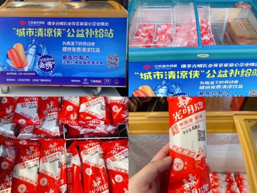 公益补给站的冷饮冰柜,里面装满了光明冷饮和其他饮料,供环卫工人、外卖小哥、快递员、执法队员等户外工作者免费取用,让他们在坚守工作岗位的时候,能够享受片刻清凉。活动启动前夕,光明乳业旗下益民一厂的配送人员从凌晨4点开始配送,经过数小时的快马加鞭,终于把光明冷饮在南京全市所有补给站配送到位。