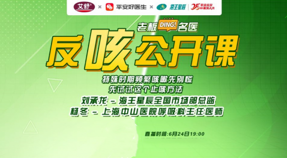 平安好医生APP携手艾舒和海王星辰健康药房,推出《老板DING名医之反咳公开课》系列直播活动,把医药健康知识搬上直播平台,方便为大家解惑,教大家正确认识和区分普通感冒和新冠肺炎,也让大家坐在家里就能学习更多止咳的方法,减少外出与人群接触的风险。