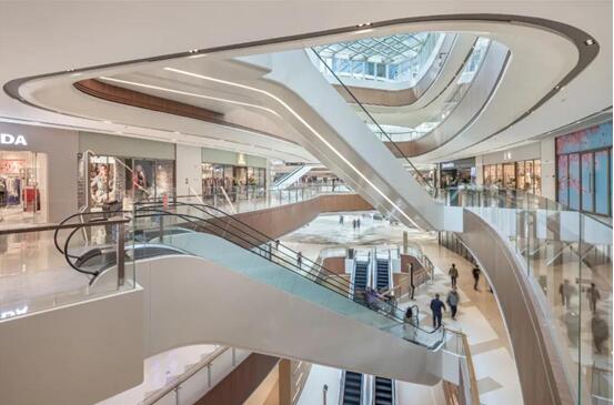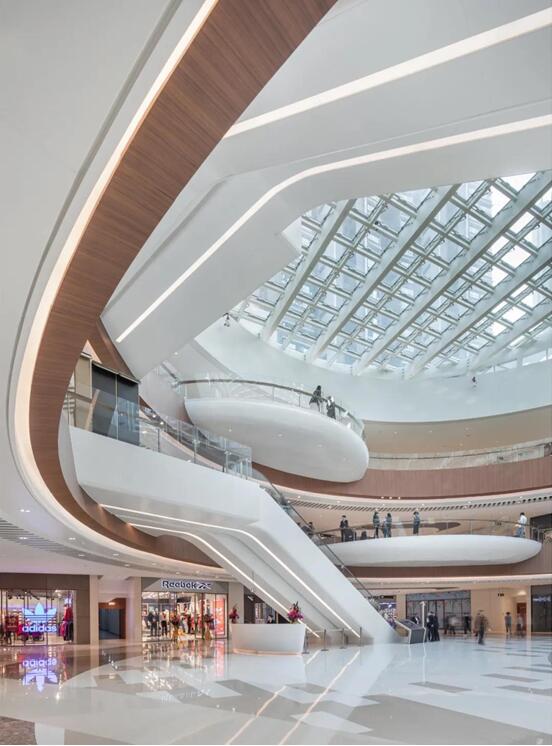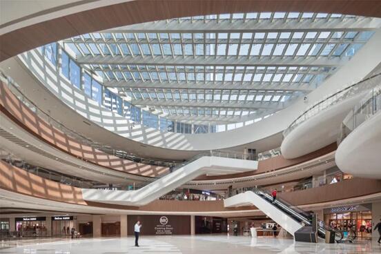 顶部大面积玻璃天幕自然采光,节省灯光的同时也能给商场内部带来柔和的自然光;不但减少阳光对室内温度的变化,还吸引周边游客,增加人流。