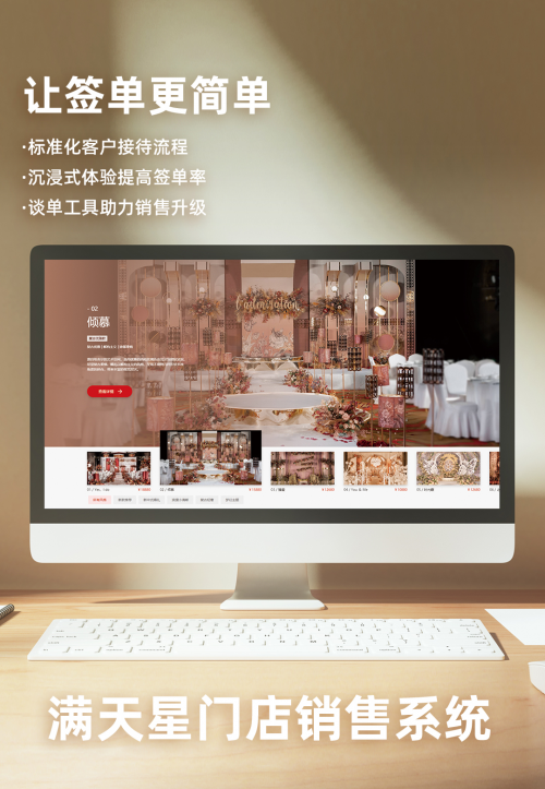 满天星门店销售系统作为婚企销售的升级工具,可以帮助婚企在销售过程中提升其专业度,从而让用户更加明确的了解产品的设计水平,更加切身体会到标准周到的服务流程,进而建立信任感,降低与客户之间的沟通成本,最终助力销售。