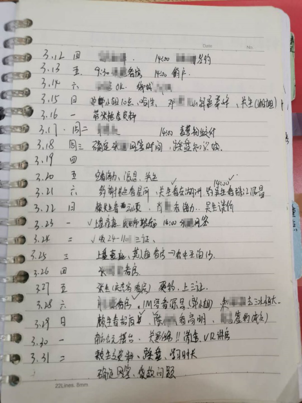 在一本厚厚的笔记本上,编者看到朱玉嫣详细记录着每天的行程安排和客户跟进情况。“我是一个不喜欢拖沓的人,每天要带看哪位客户,踩什么楼盘,我都会提前记在本子上,这样做事会更有条理和效率。”她说。