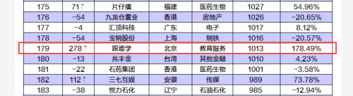 在中国市值500强榜单中,在线教育培训公司跟谁学因市值突破1000亿美元,排名猛增278位至第179位,成为榜单中排名增长最快的公司之一,是目前国内市值唯一突破千亿的在线教育企业,也是继新东方、好未来之后,又一家市值突破千亿的教育培训企业。
