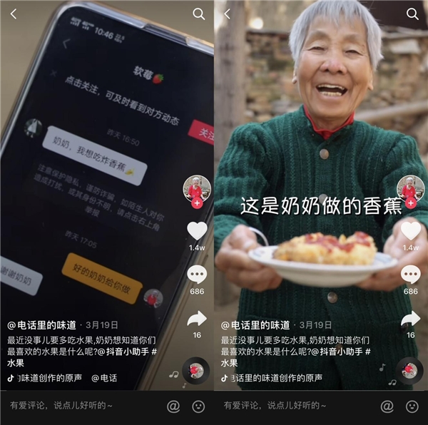 一次在乡村拍摄的经历,让古景认识了岳奶奶。他和岳奶奶、奶奶的家人们商量,为奶奶拍摄了一系列美食短视频。岳奶奶的短视频账号有个好听的名字,叫“电话里的味道”(抖音ID:yuenainai37),因为奶奶在视频里制作的每个美食,都是奶奶从抖音评论或私信中挑选出来,为网友定制的童年回忆。
