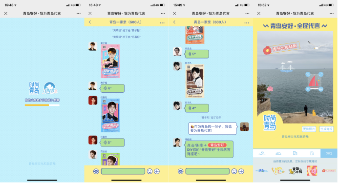 借势明星代言的热度,青岛市文化和旅游局还推出“青岛安好”全民代言主题H5。用户可以在六位明星的邀请下,上传自己的照片,通过组合不同类型的小元素、打call标语,定制个人专属的代言海报,全民齐代言,将活动推向高潮。
