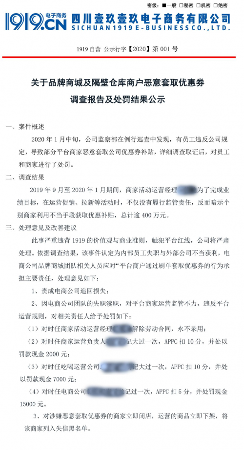 事实上,早在5月12日,1919就公布了针对1919吃喝App品牌商城及隔壁仓库部分商家通过恶意刷单套取1919优惠券补贴和个别员工失职的处罚决定。据1919发布的调查结果显示,1919内部某员工为完成业绩目标,在运营促销、拉新等活动时,不仅没有履行监管责任,反而暗示个别商家利用不当手段获取优惠补贴,金额超过400万元。