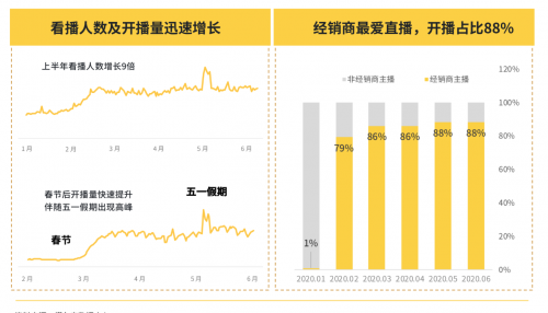 事实上,直播确实在越来越多地参与汽车交易,这种易于年轻用户接受的形式,正起到重要作用。据《报告》显示,五一后车市回暖后,车企和经销商仍然没有放弃直播营销的方式,并出现开播峰值。同时,直播间的潜在客户数量也在提升,今年1月至6月该数字提升了近100倍。