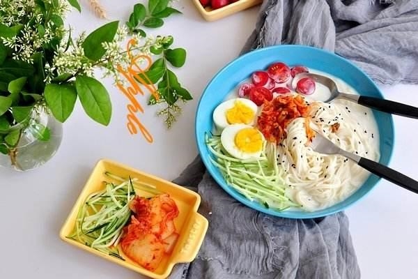 许多人在三伏天没有胃口,而一碗豆浆面则能给炎热疲惫的身心带来活力补养。黄豆素有"植物之肉"的美称,是摄取蛋白质的主要食物,韩国人认为,为了保证身体健康,必须每天都吃豆类食品。豆浆面做法简单,味道清淡且不失美味配上韩国辣白菜,超赞!