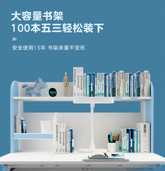 市场上现有学习桌,高度集中在50-80厘米,许多商家都说他们的学习桌满足3-18岁孩子的使用,其实不然,50-80厘米的高度其满足的需求为坐着写字、阅读、画画。当孩子大于10岁,学业压力的增大,学习的方式也不一样,如需要站立朗诵和背书时,桌面高度最低要求80厘米市面现有学习桌高度完全不支持。
