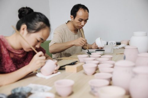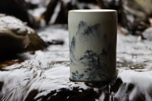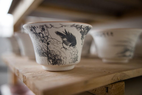 小根老师算得上蒲石特聘画师了,虽然年纪轻轻,他对中国画在陶瓷上的表现艺术之痴迷,实属罕见。在这种浮躁的社会背景下,年长艺术家亦不乏沽名钓誉,其实难副之辈,能静下心钻研国画工笔的年轻人更加寥寥,学艺途中或天赋不佳,或心性不稳,有大成者凤毛麟角。艺术造诣这事,天赋是一部分,却也更加离不开一个“痴”字,小根老师多年前不远千里从湘赴景,醉心陶瓷绘画创作,看他作画,那感觉便是与众不同的静谧,神态上沉凝着对艺术的虔诚和尊重,落笔有神,目如朗星,他说:绘画是他修行的方式。你在他的作品里能体会另一番真实天地间的美和安静。