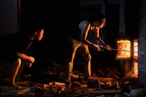 蒲石柴窑生产团队里大都是一些汉子,是能吃苦,亦是满腔热忱的工匠,既有技艺卓绝的老师傅,也有正值青春的小伙子。拉胚,修胚,吹釉,烧制,每一步工序,汉子们都做的一丝不苟。窑主石骏和工匠们经常一起搬运泥料,天气太热,就打个赤膊。每一道工序,窑主都会亲自把关,以求入窑烧制前万无一失。待器物入窑,石骏便和工匠们一起守着柴窑,披星戴月,以期无虞。虽有经验老到的把桩师傅,但柴窑的不可控性,可谓是“靠天吃饭”,只有把该做好的全都做好,才能静候佳音。窑主和伙伴们通常每次烧制都需要日夜守着柴窑烧足近30多小时,在1300度高温附近,寸步不离的把控,火舌冲天,不仅炙热难耐,让人汗如雨下,而且光亮灼刺双眼,让人不禁落泪。若非匠人真性情,有着对器物的珍爱和热忱,试问谁能数年如一日,坚守在这风火之畔呢?出窑后有“满盘皆输”的心酸,出窑也会有“色质俱佳”的狂喜,器物牵动着年轻匠人的悲喜,若非感同身受,寻常人难以理解为何匠人和柴窑器物如此“虐恋”?桃李不言,下自成蹊,绝伦的柴窑器物背后是匠人难以想象的付出,难以言表的痴情,难以彰显的浪漫情怀!