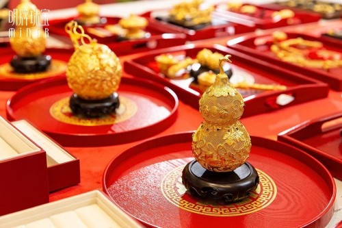 中式婚礼是华夏文化重要的组成部分之一,中华上下五千年以来留存了很多婚嫁礼俗一直延续至今。现在有些地方还可以看到“十里红妆”这种婚嫁非遗文化景象。新娘出嫁时凤冠霞帔,嫁妆雕龙刻凤、涂朱贴金,极尽奢华,送亲队伍绵延数里,犹如一条披着红袍的金龙,故称“十里红妆”。 十里红妆展示了众多传统文化与技艺,承载着亲人对新人新生活的美好祝福。在嫁妆中金饰是不可或缺的一种,好的金饰还可作为传家之宝代代相传。为此明牌珠宝别出心裁的将婚嫁吉祥元素与主打的传家金系列结合在一起,打造出了一套传统的婚嫁金饰,既可出嫁时佩戴,又可作为摆件,极具收藏价值。