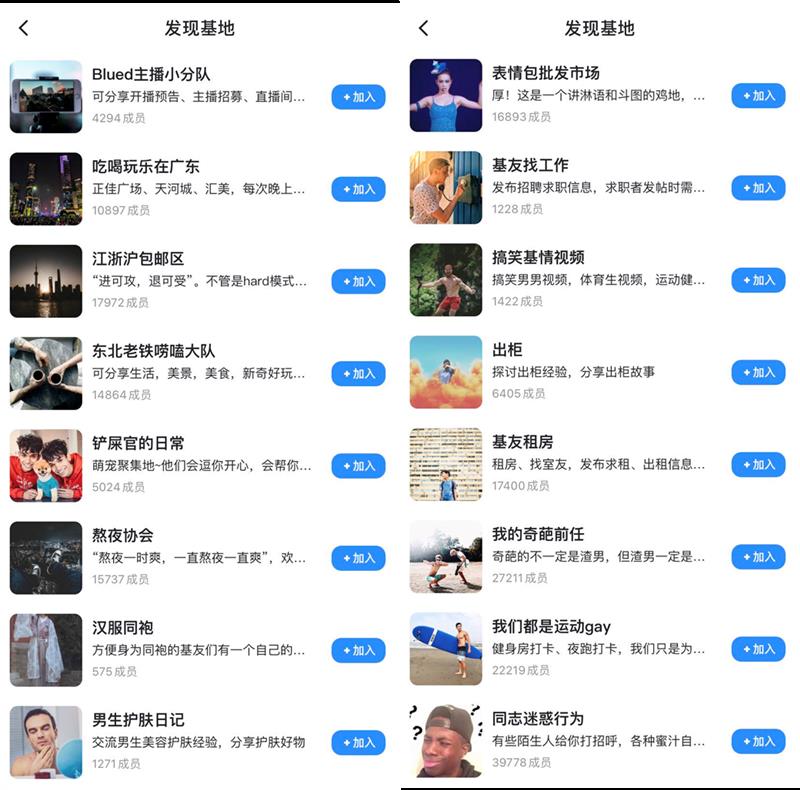 据了解,“基地”内设有多个兴趣版块,用户可以根据共同的兴趣和背景选择加入并进行互动,在兴趣相投的背景中,沟通效率大大提高。对此,Blued相关产品负责人表示:“基地功能以兴趣为导向,我们希望新添加的功能可以帮助用户更好地找到志同道合的朋友。”