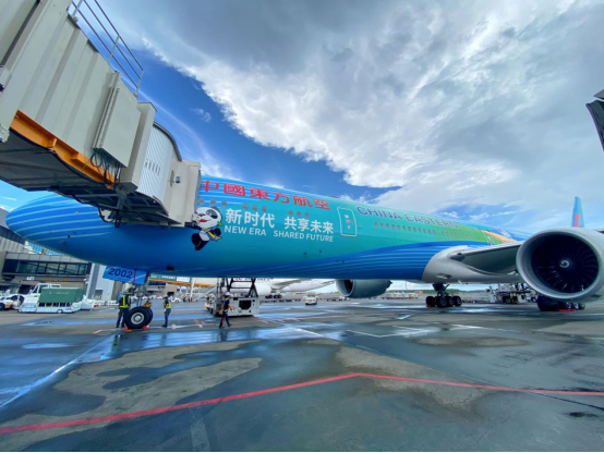 “进博号”是在东航目前载客量最大、航程最远、搭载全球领先客舱服务系统的国际远程旗舰宽体机——波音777-300ER飞机上进行的喷涂,整个彩绘以进博主色调黄蓝两色为基色、吉祥物“进宝”手持四叶草,实现了进博文化和飞机美学的完美融合,向各国旅客带去幸运与祝福,传递开放合作的进博理念。