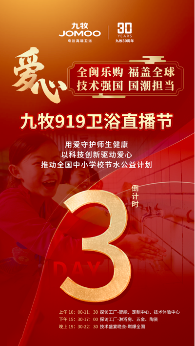 全闽乐购,福盖全球。9月19日,九牧将在总部泉州隆重举办主题为“技术强国,国潮担当”的卫浴直播节,通过打造最有爱的科技卫浴直播,构筑美好数字生活,在海上丝绸之路的起点再掀“智造风”、“国潮风”与“数字风”,创新驱动产业升级,引领海西经济聚势发展。