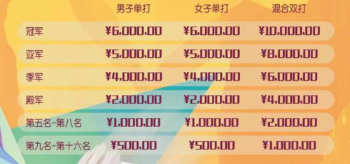 总决赛阶段,男子单打、女子单打、混合双打项目16强,即可瓜分12万奖金和证书。其中前3强还有奖杯、奖牌。