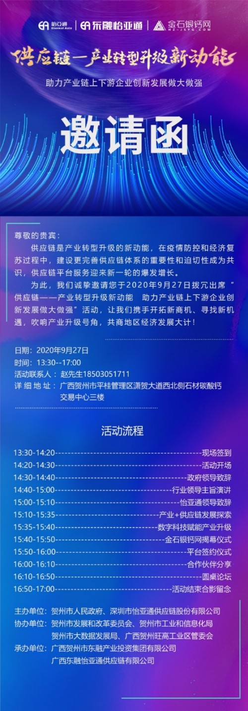 在此,我们诚邀您参加 2020 供应链——产业转型升级新动能会议,9 月 27 日13:30-17:00,贺州不见不散,怡亚通官方抖音号同步直播。