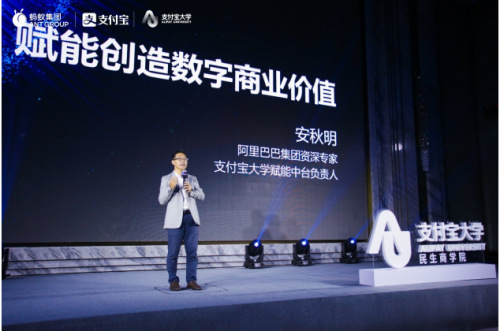 为帮助民生服务行业实现数字化转型,支付宝大学成立了民生商学院,通过教育培训,帮助民生服务机构从组织和业务两方面提升数字化能力。支付宝大学赋能中台负责人安秋明在会上做了题为:赋能创造数字商业价值的主旨演讲。