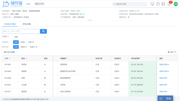 记者在其管理页面看到,学校总体返校进度、各学院辅导员所带学生返校情况一目了然,48小时返校注册率超95%。