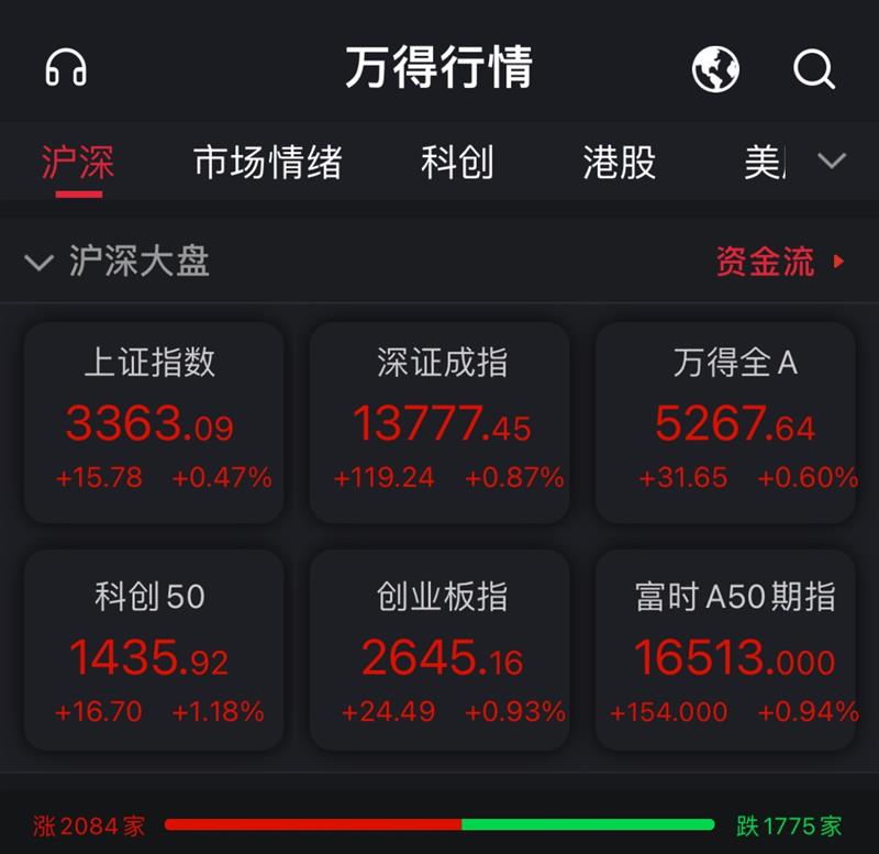 截至收盘,沪指报3363.09点,涨幅0.47%,成交额3195.2亿元;深成指报13777.45点,涨幅0.87%,成交额4547.67亿元;创业板指报2645.16点,涨幅0.93%;上证50指数报3410.09点,涨幅0.68%。