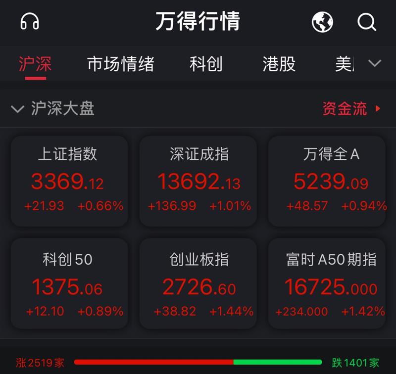 截至收盘,沪指报3369.12点,涨幅0.66%,成交额3162.29亿元;深成指报13692.13点,涨幅1.01%,成交额3935.3亿元;创业板指报2726.60点,涨幅1.44%;上证50指数报3467.77点,涨幅1.16%。
