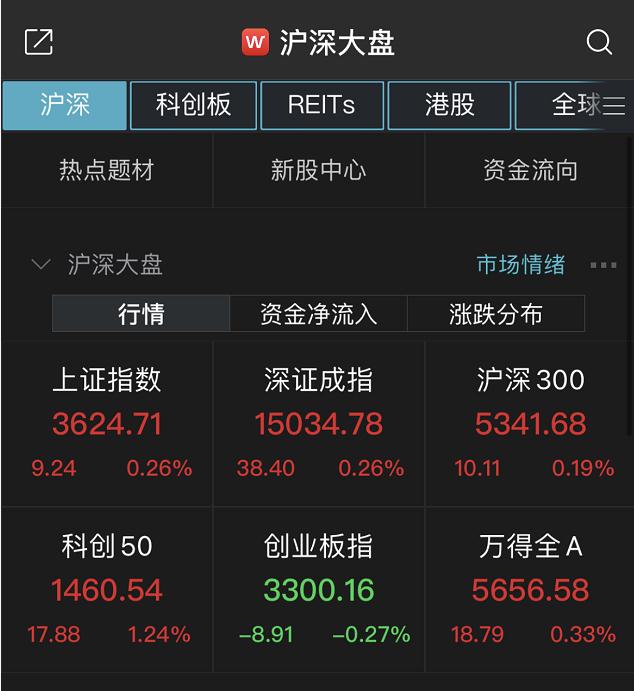截至收盘,沪指报3624.71点,涨幅0.26%,成交额4716.63亿元;深成指报15034.78点,涨幅0.26%,成交额5751.97亿元;创业板指报3300.16点,跌幅0.27%。